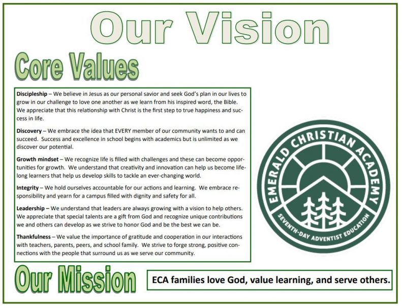 Emerald Christian Academy is part of the Oregon Conference of Seventh-day Adventists. Our core values of our vision - to Love God, Value Learning, and Serve Others is in harmony with our school’s support of the “Oregon Model” —dedicated to a Christ-centered culture, restorative disciplinary practices, and social-emotional learning opportunities.